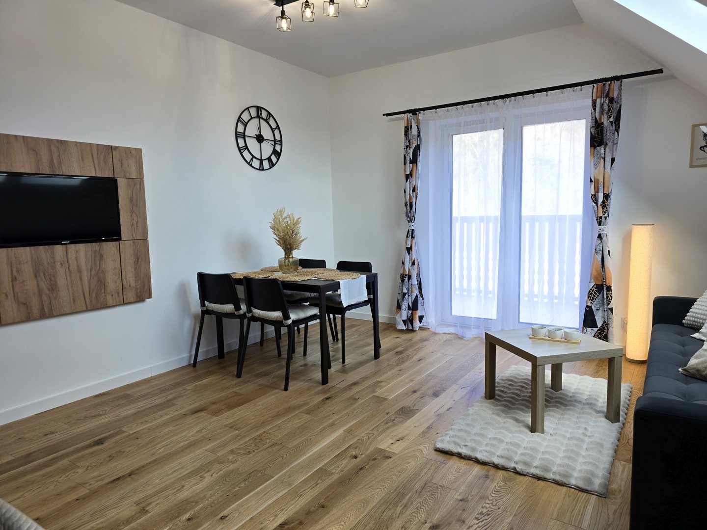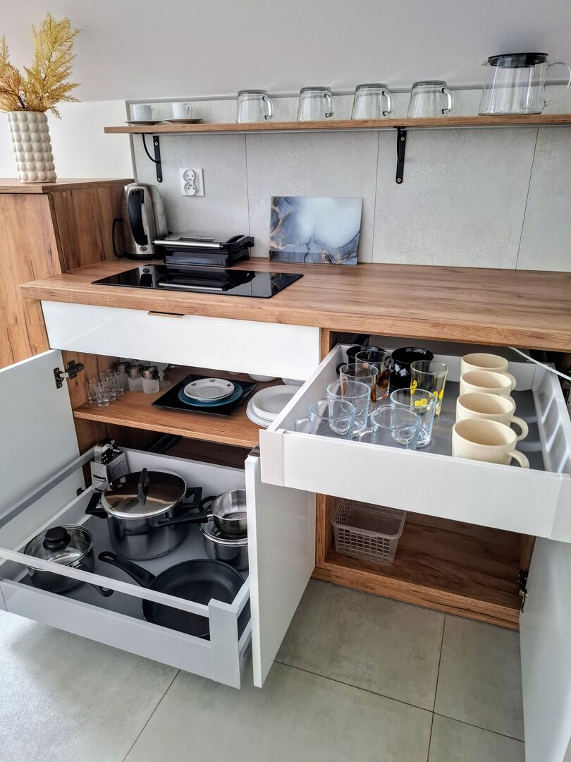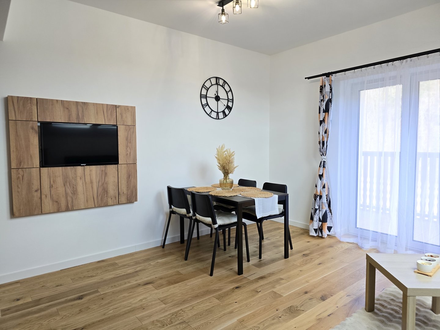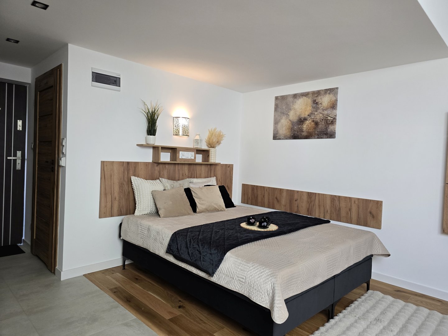 Apartament jest nowocześnie urządzony i w pełni wyposażony. Składa się z salonu z aneksem kuchennym i łazienki. Pełnowymiarowa kuchnia z lodówką, płytą indukcyjną i zmywarką wyposażona w czajnik, naczynia, kuchenkę mikrofalową, garnki i sztućce. Wygodna łazienka z kabiną prysznicową, wc i umywalką, ręczniki i suszarka do włosów w standardzie.