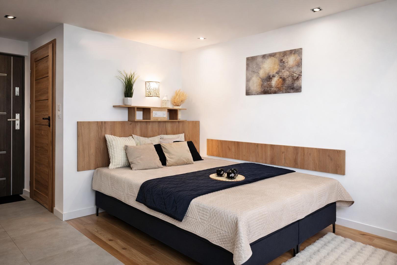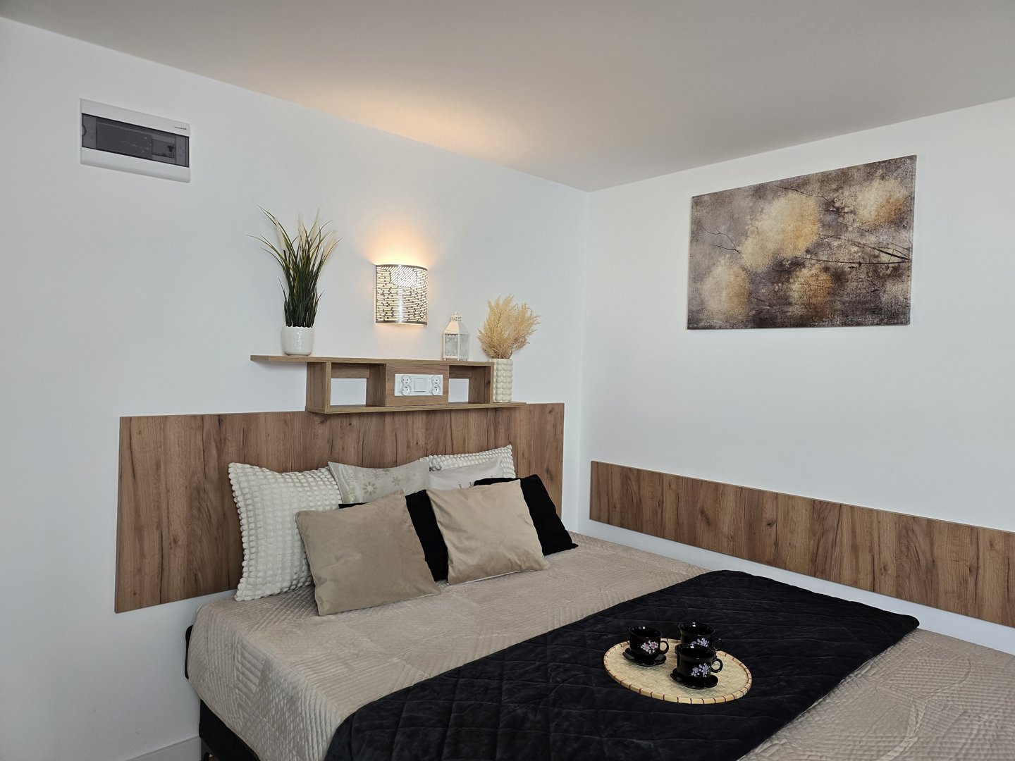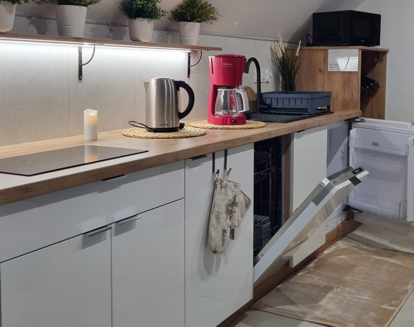 Apartament jest nowocześnie urządzony i w pełni wyposażony. Składa się z salonu z aneksem kuchennym i łazienki. Pełnowymiarowa kuchnia z lodówką, płytą indukcyjną i zmywarką wyposażona w czajnik, naczynia, kuchenkę mikrofalową, garnki i sztućce. Wygodna łazienka z kabiną prysznicową, wc i umywalką, ręczniki i suszarka do włosów w standardzie.
