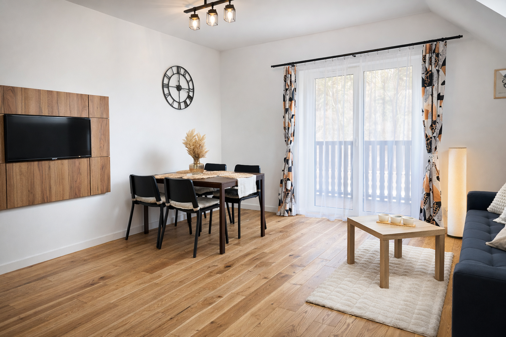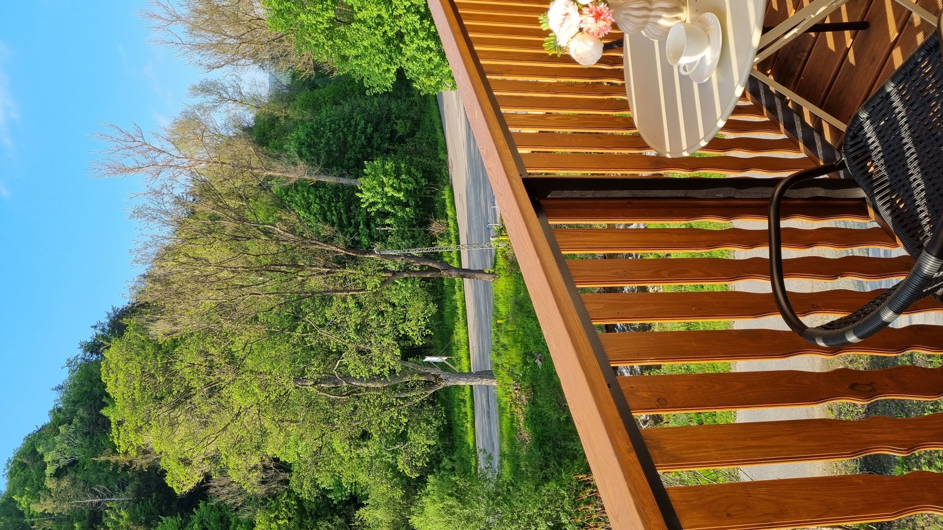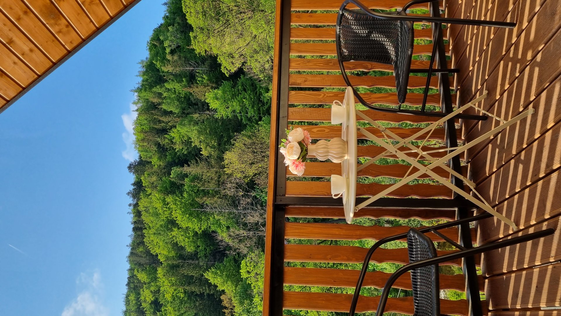 Apartament z balkonem i stolikiem z krzesłami, z którego rozpościera się cudowny widok na górę Sowia Kopa i rzekę Białą Lądecką.