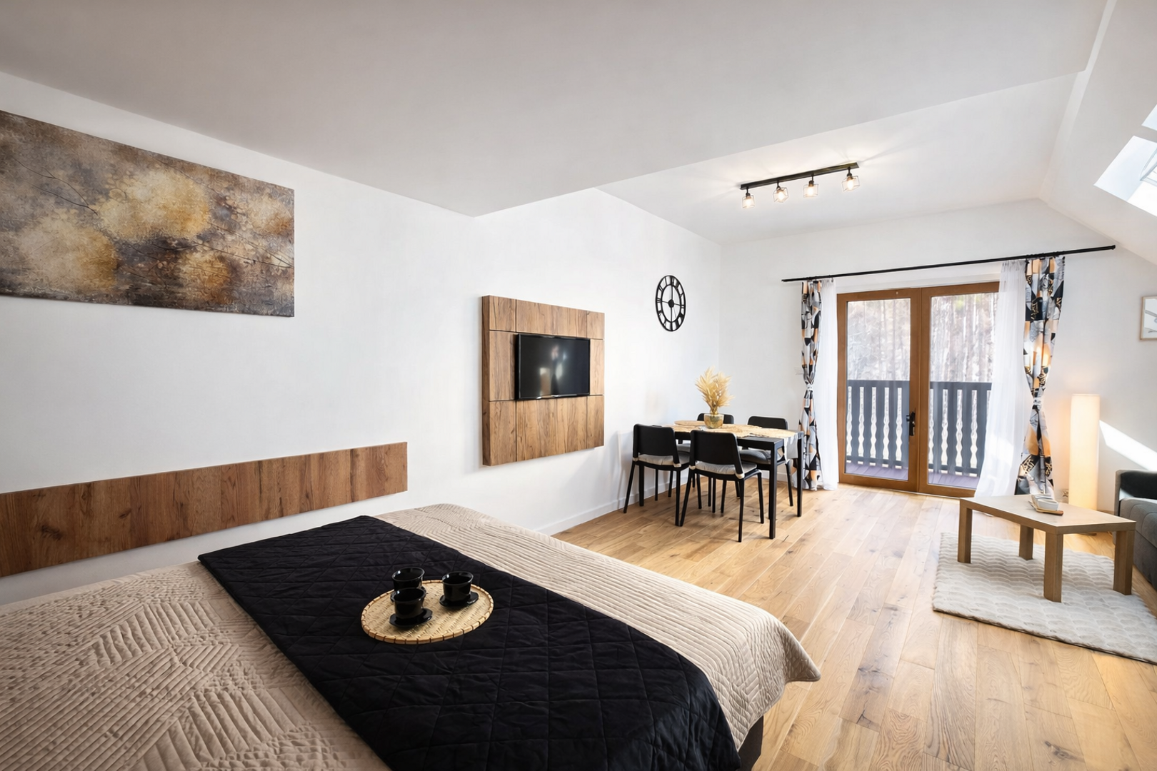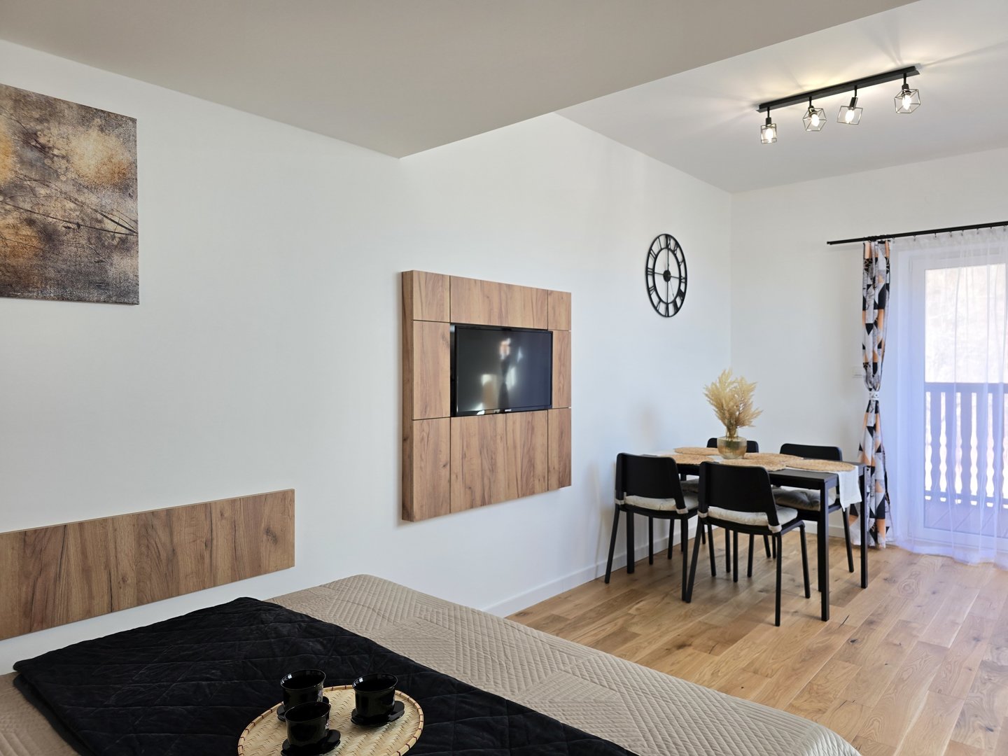 Część sypialna z małżeńskim łóżkiem 160 cmx200 cm (z kompletem pościeli). W strefie wypoczynkowej znajduje się duża, rozkładana sofa, (z kompletem pościeli) i stolik kawowy. W częsci jadalnej stół z 4 krzesłami.