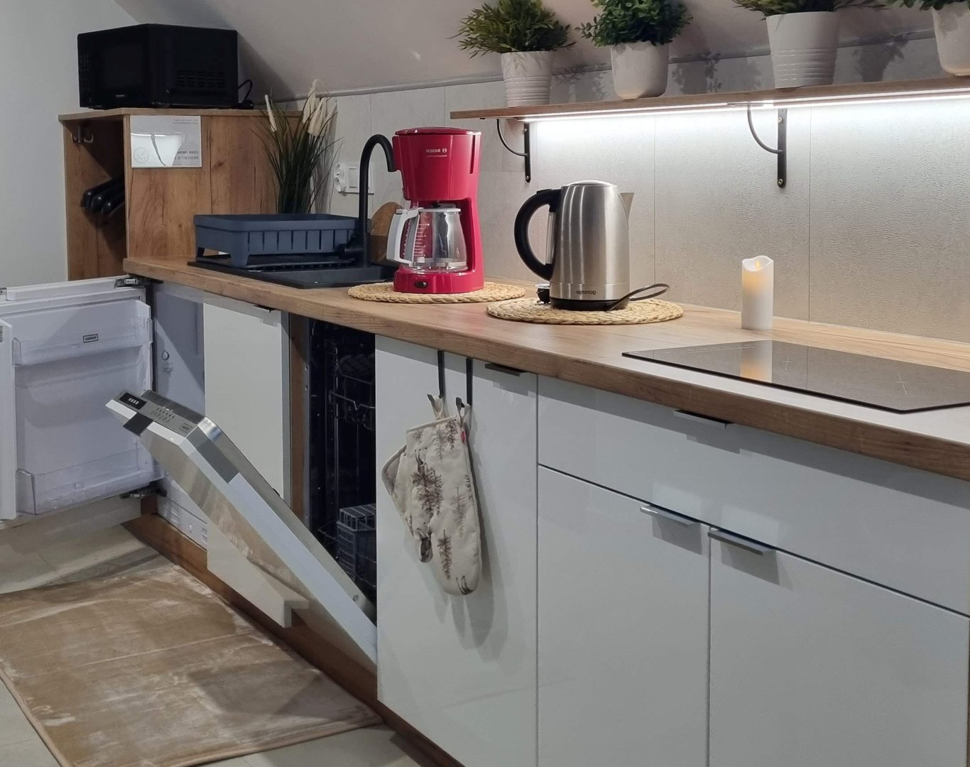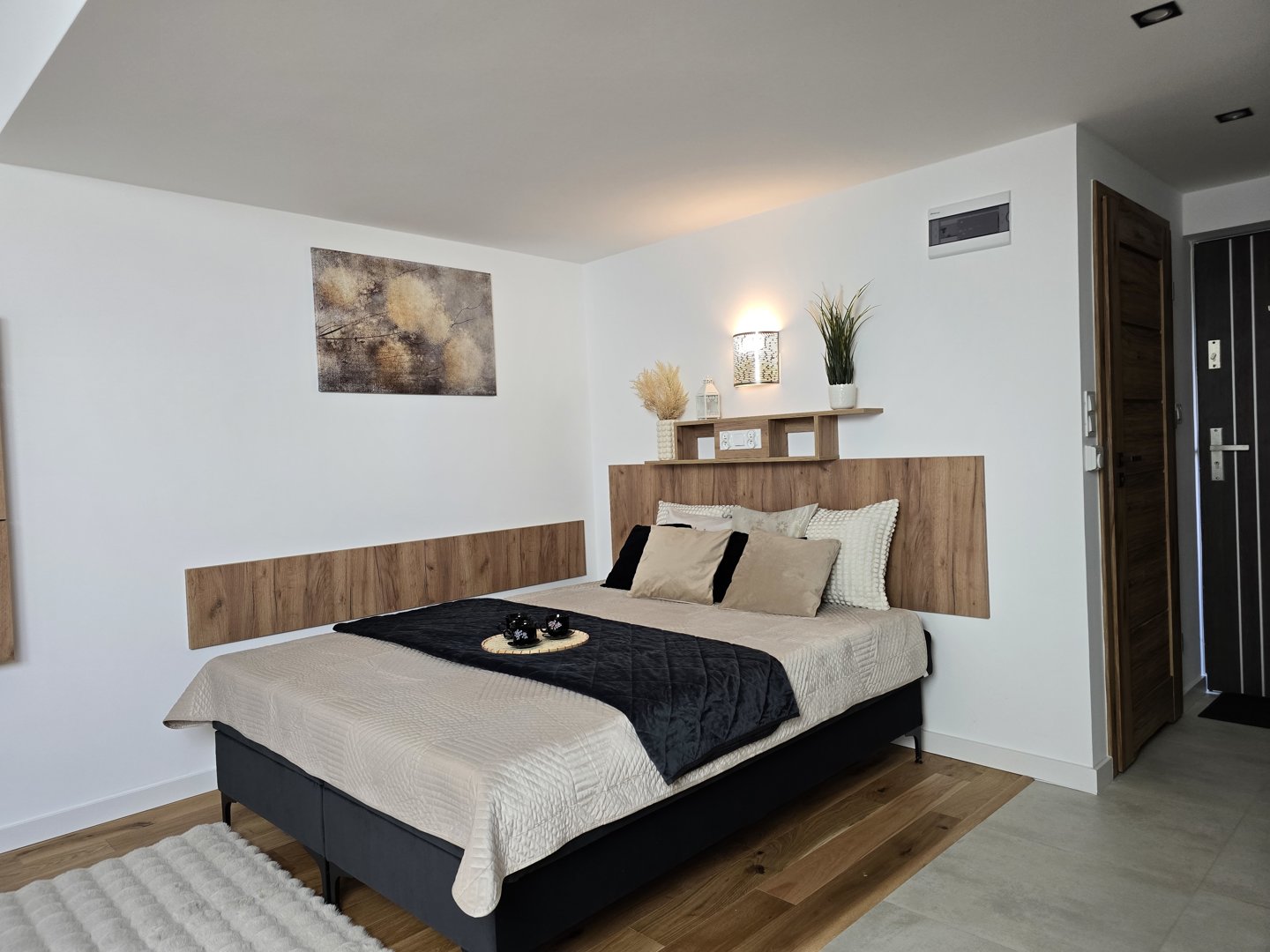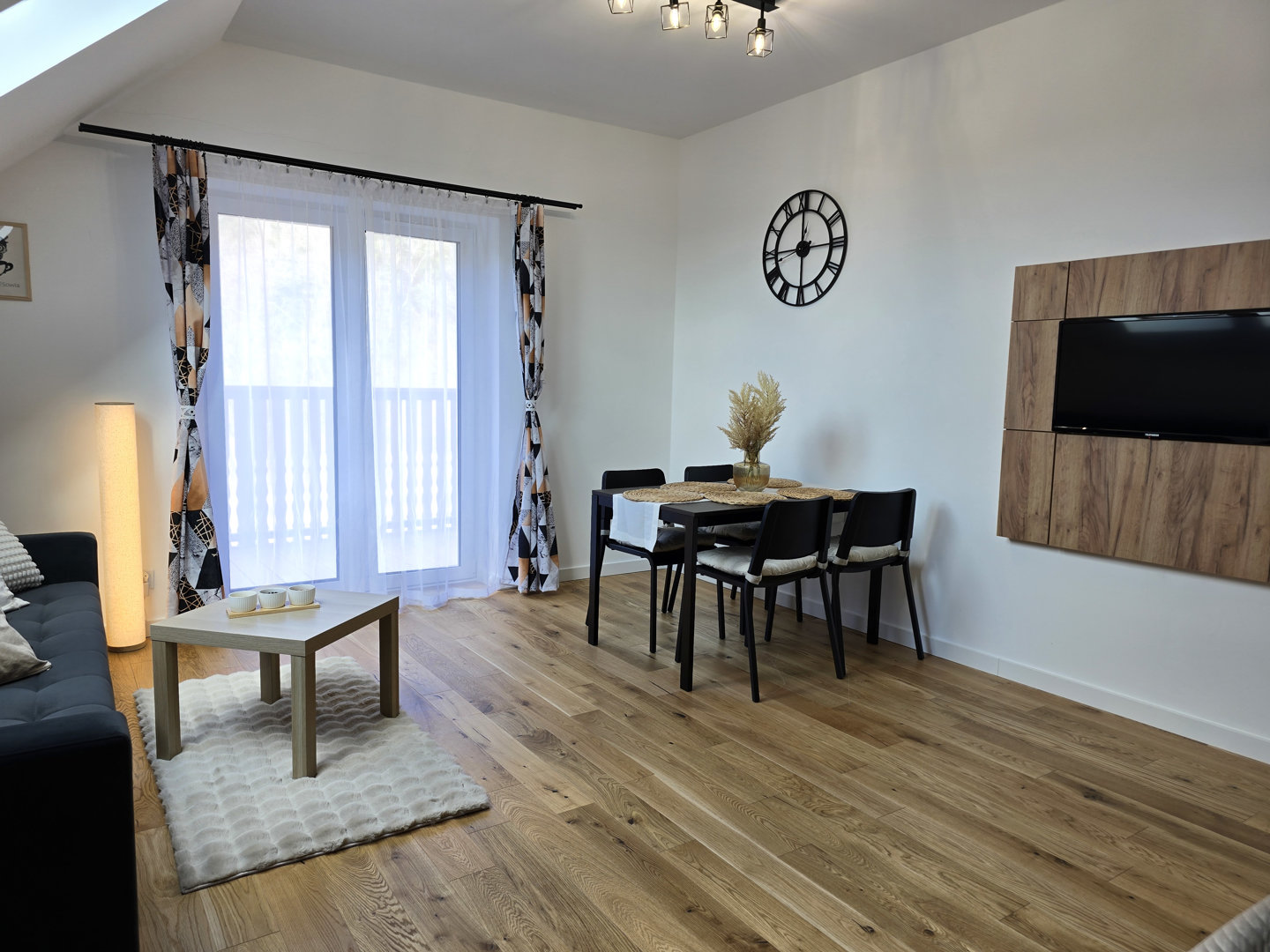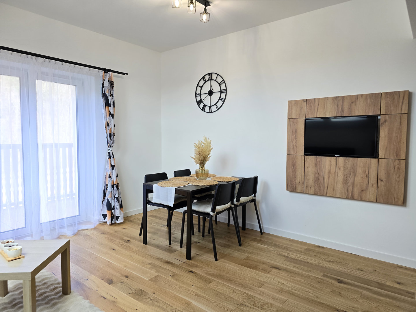 Apartament jest nowocześnie urządzony i w pełni wyposażony. Składa się z salonu z aneksem kuchennym i łazienki. Pełnowymiarowa kuchnia z lodówką, płytą indukcyjną i zmywarką wyposażona w czajnik, naczynia, kuchenkę mikrofalową, garnki i sztućce. Wygodna łazienka z kabiną prysznicową, wc i umywalką, ręczniki i suszarka do włosów w standardzie.