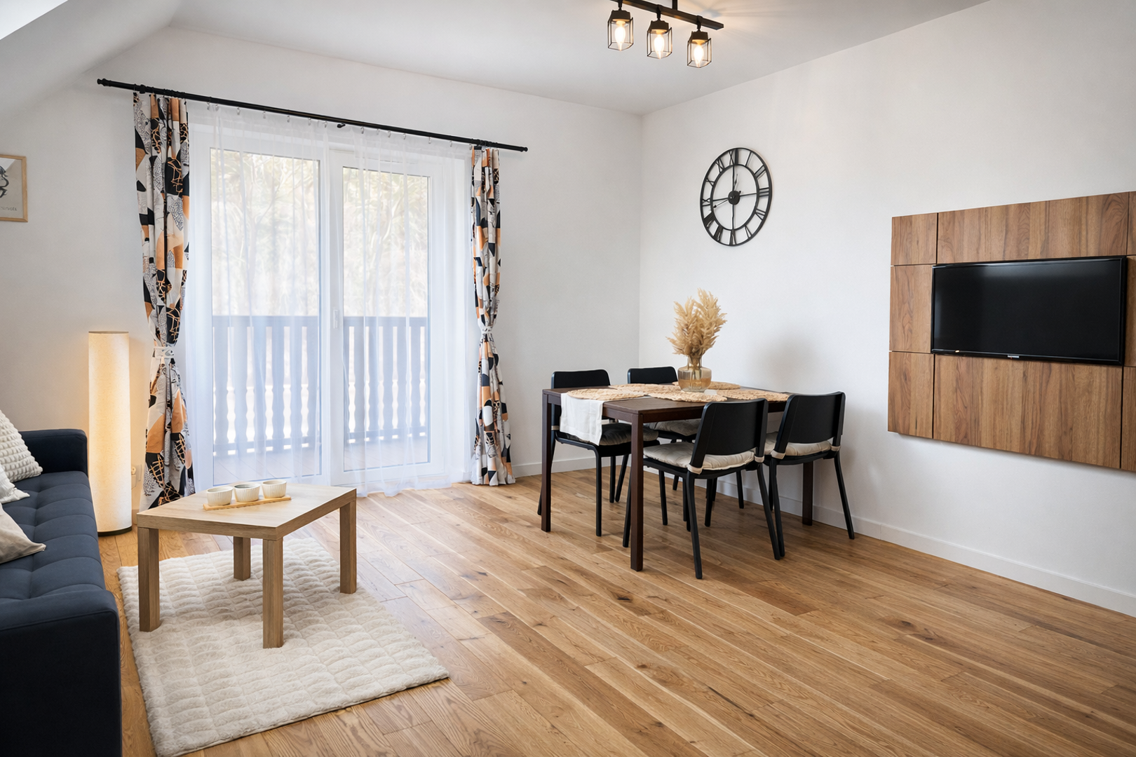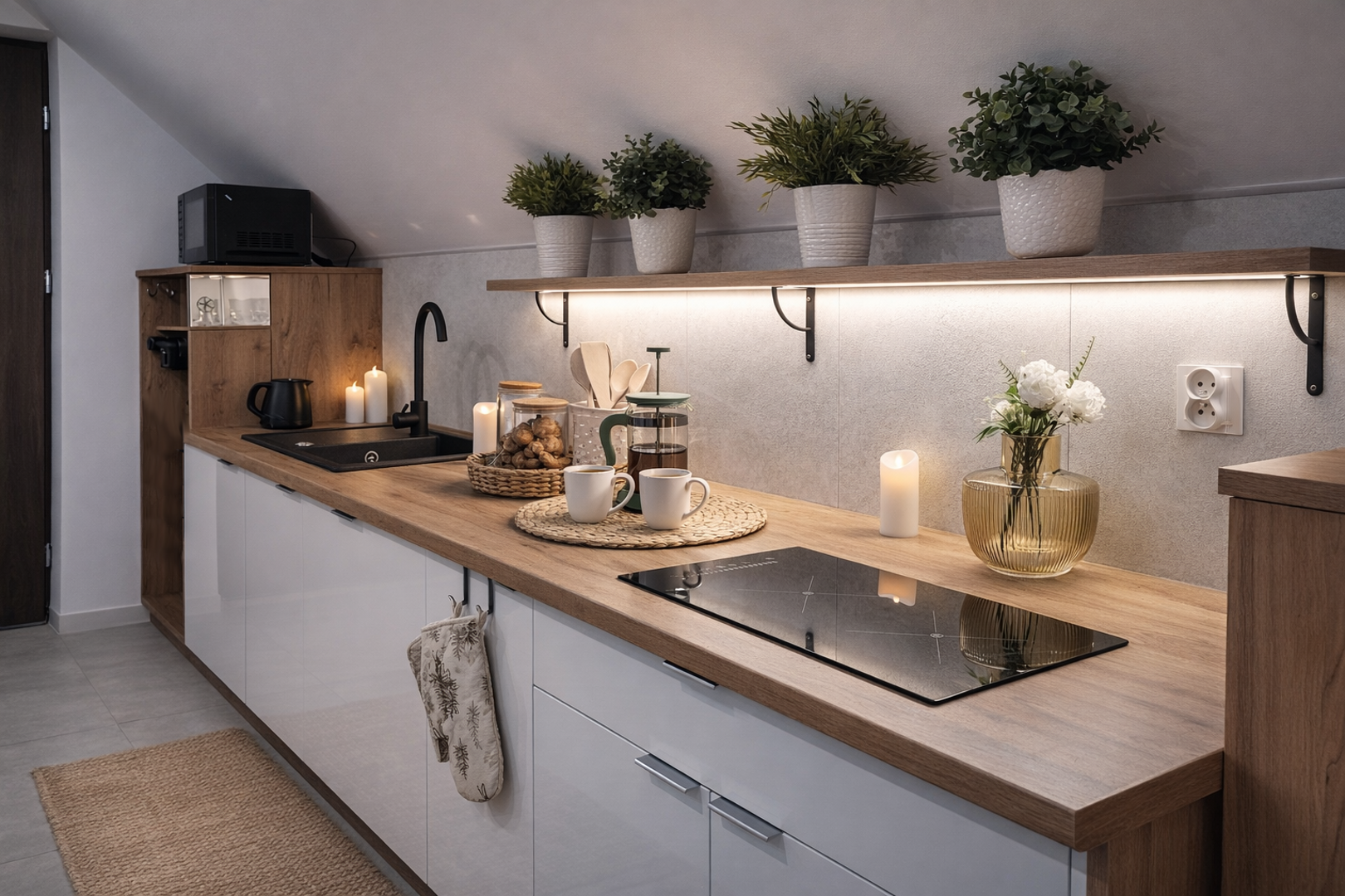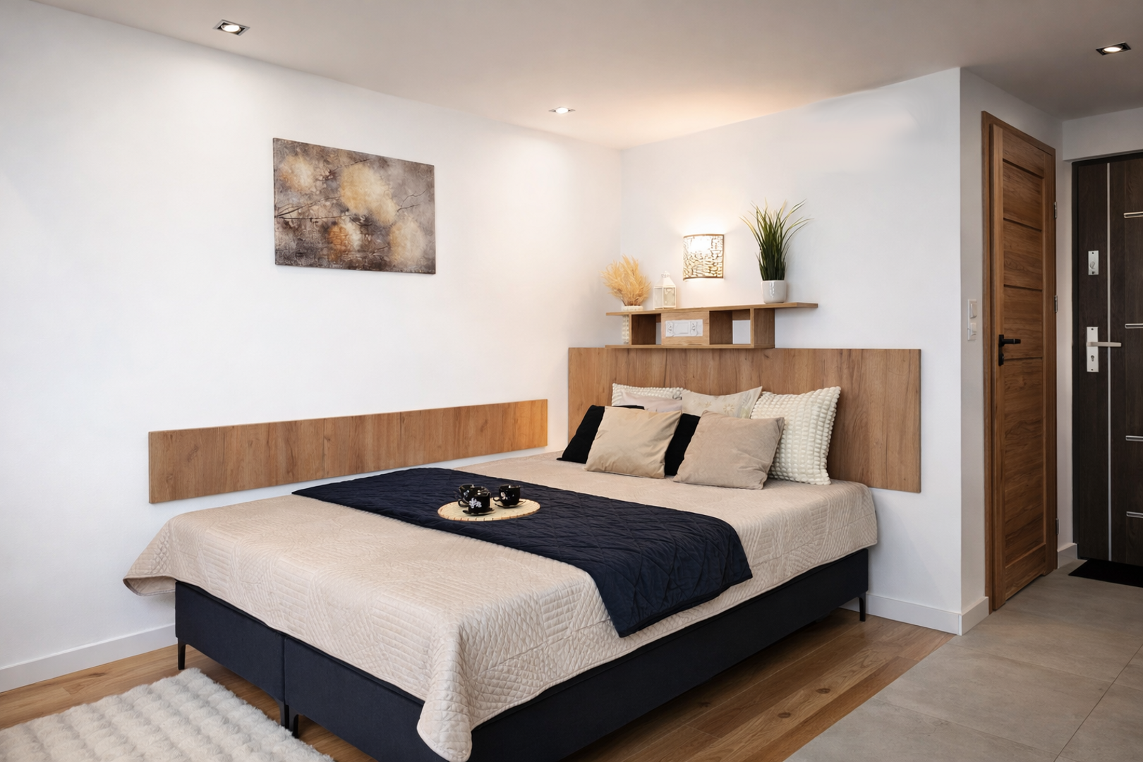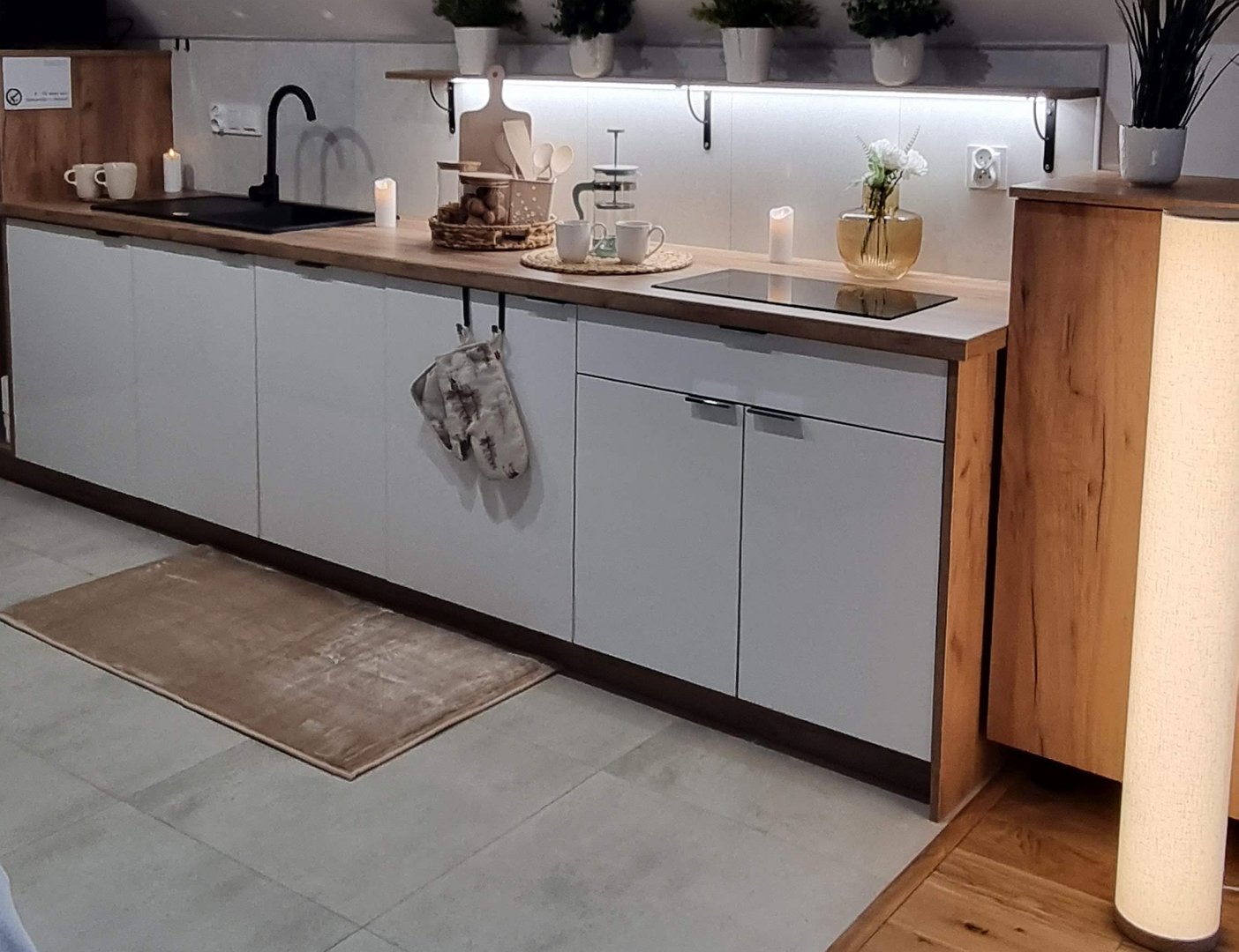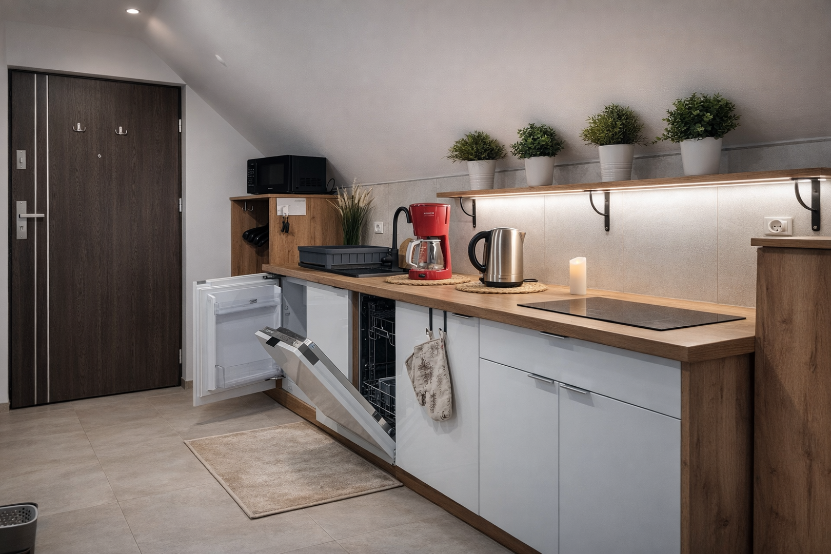 Apartament jest nowocześnie urządzony i w pełni wyposażony. Składa się z salonu z aneksem kuchennym i łazienki. Pełnowymiarowa kuchnia z lodówką, płytą indukcyjną i zmywarką wyposażona w czajnik, naczynia, kuchenkę mikrofalową, garnki i sztućce. Wygodna łazienka z kabiną prysznicową, wc i umywalką, ręczniki i suszarka do włosów w standardzie.
