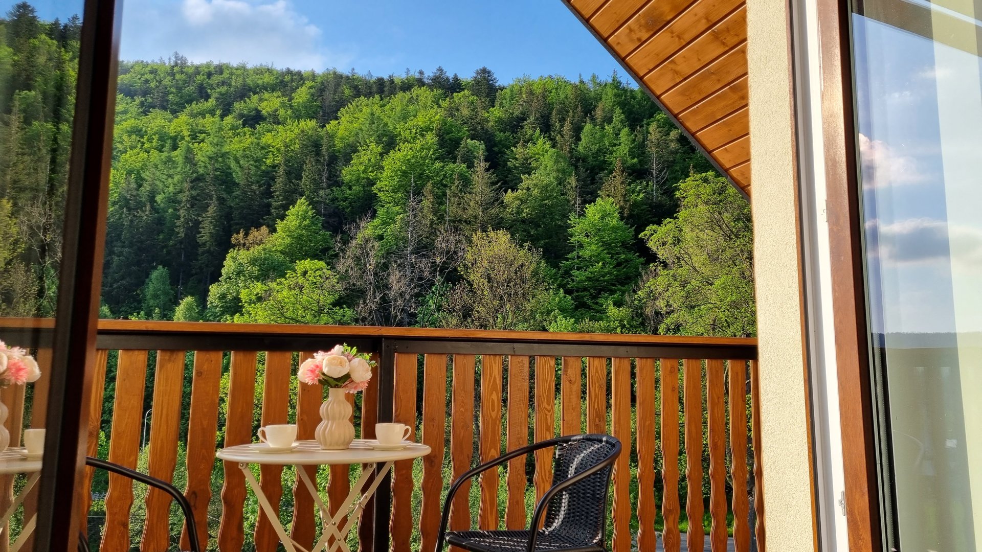 Apartament z balkonem i stolikiem z krzesłami, z którego rozpościera się cudowny widok na górę Sowia Kopa i rzekę Białą Lądecką.