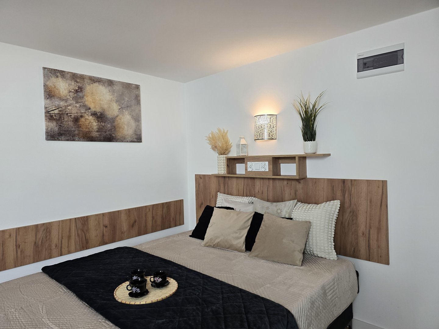 Część sypialna z małżeńskim łóżkiem 160 cmx200 cm (z kompletem pościeli). W strefie wypoczynkowej znajduje się duża, rozkładana sofa, (z kompletem pościeli) i stolik kawowy. W częsci jadalnej stół z 4 krzesłami.